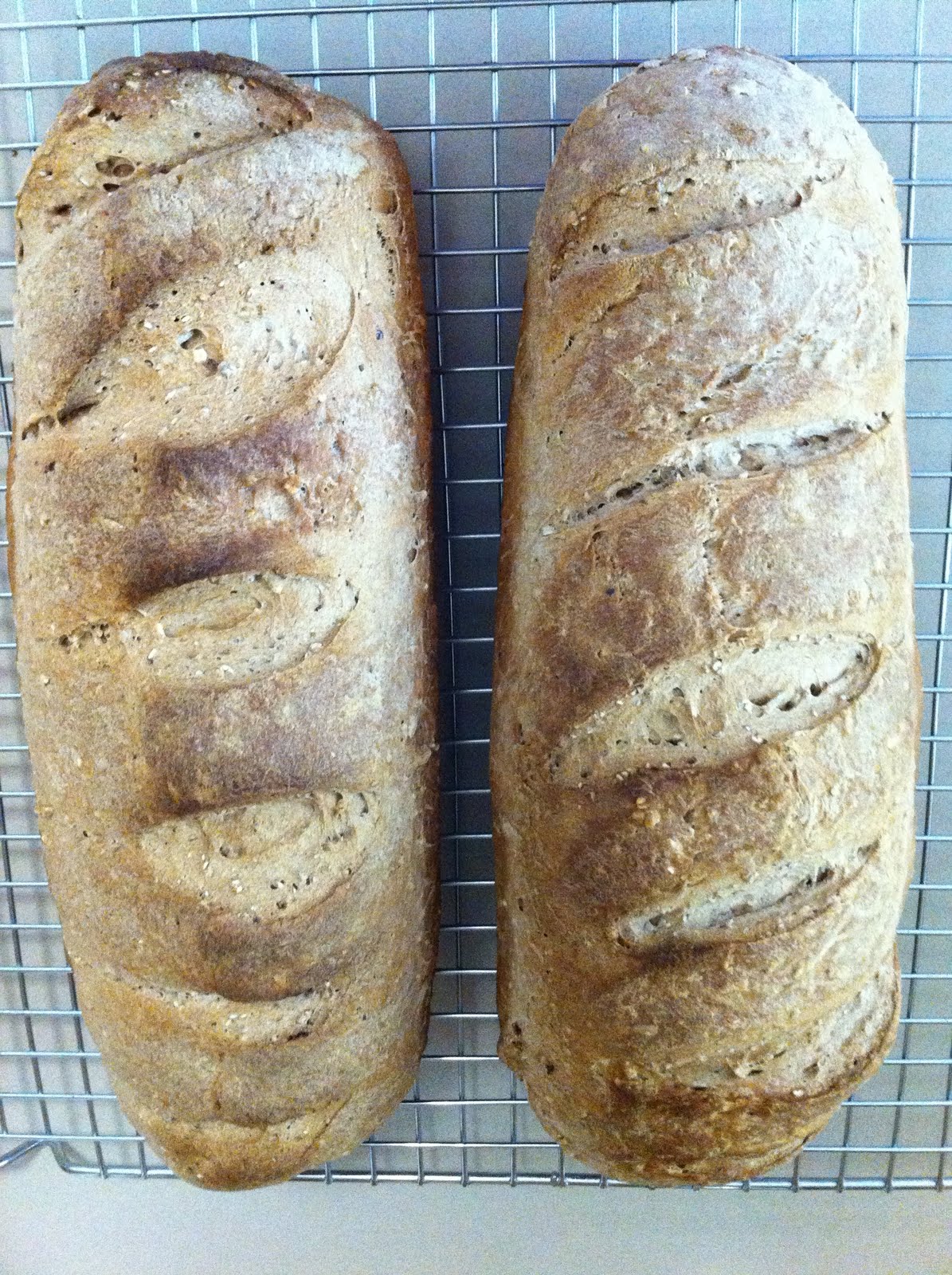 I could hardly wait to get to the next stage, which is where you punch down the dough to knock out the air it's acquired is it rises. Then I divided the dough into two and formed the pieces into loaves by kneading it in a rolling action. This ensured the exterior remained nice and smooth and visually attractive. I scored the top of each loaf then put each one into a greased tin to let it prove by the heater a second time.